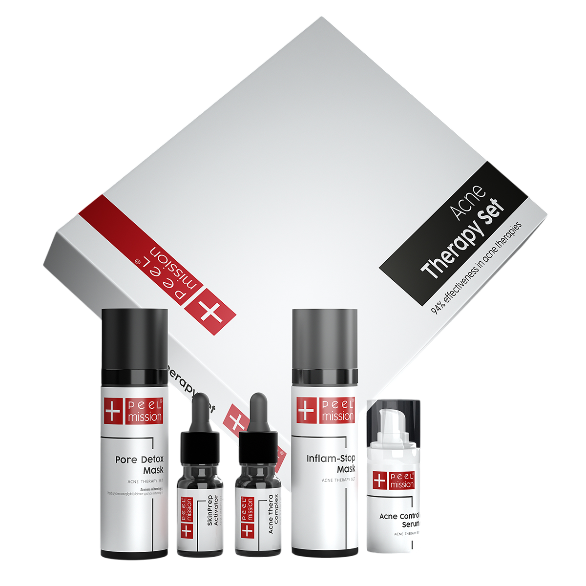 Peel Mission представя Acne Therapy Set – първото двупосочно лечение на акне с доказана 94% ефективност. Системата съчетава професионална терапия в козметичния кабинет и домашна грижа, осигурявайки пълен контрол върху комедоните, възпаленията и постакне белезите. Благодарение на активни съставки като азелаинова, шикимова и пирувикова киселина, ниацинамид и зелена глина, кожата се пречиства, детоксикира и възвръща своя баланс.